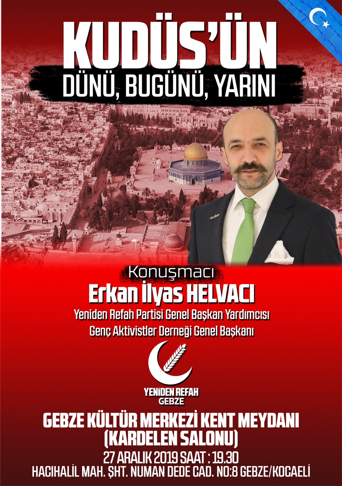 Yeniden Refah Partisi Gebze İlçe Başkanlığı, Filistin’de yaşanan insan hakları ihlallerini 27 Aralık 2019 Cuma günü saat 19:30 da Gebze Kültür Merkezinde düzenleyecekleri bir konferansla masaya yatırıyor.