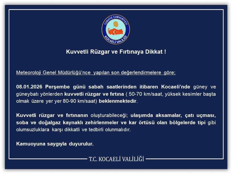 08.01.2026 Perşembe günü sabah saatlerinden itibaren Kocaeli’nde güney ve güneybatı yönlerden kuvvetli rüzgar ve fırtına ( 50-70 km/saat, yüksek kesimler başta olmak üzere yer yer 80-90 km/saat) beklenmektedir.