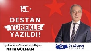 Öz Gülhan Turizm Yönetim Kurulu Başkanı Naim Gülhan, '15 Temmuz Demokrasi ve Milli Birlik Günü'nün yedinci yıl dönümü dolayısıyla yaptığı açıklamada, Fetullahçı Terör Örgütü (FETÖ) tarafından kalkışılan hain darbe girişimini bir kez daha nefretle kınadı.