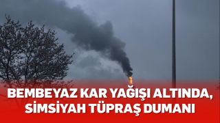 Bembeyaz kar yağışı altında, simsiyah TÜPRAŞ dumanı