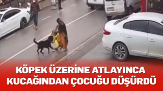 Köpek üzerine atlayınca kucağından çocuğu düşürdü